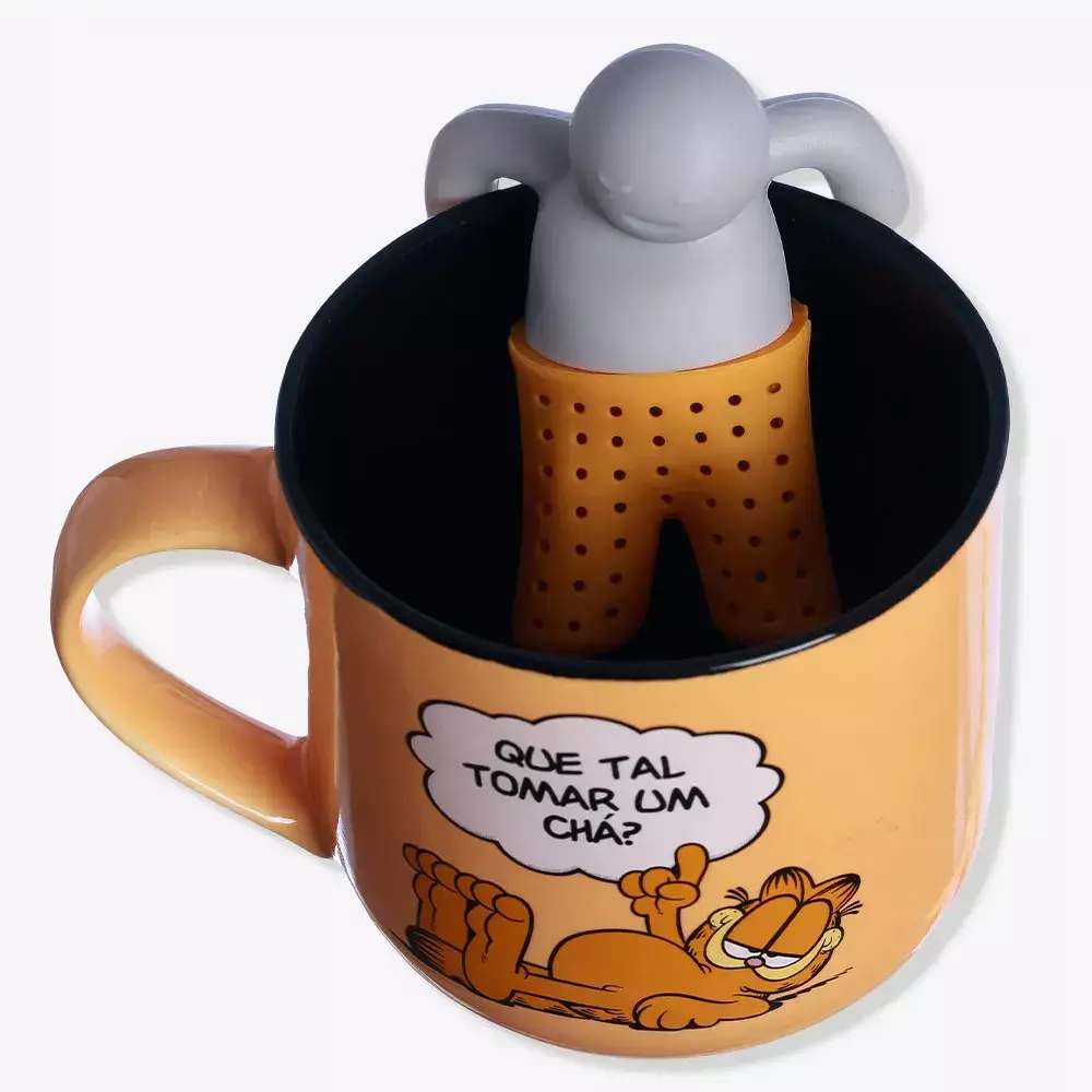 Caneca com Infusor Garfield Em tempos de Home Office um cházinho cai bem! Além de linda, faz chá, para né! Para fazer o chá é só adicionar água quente na caneca, ervas de sua preferencia no bonequinho e aguardar uns minutinhos, fácil e delicioso!